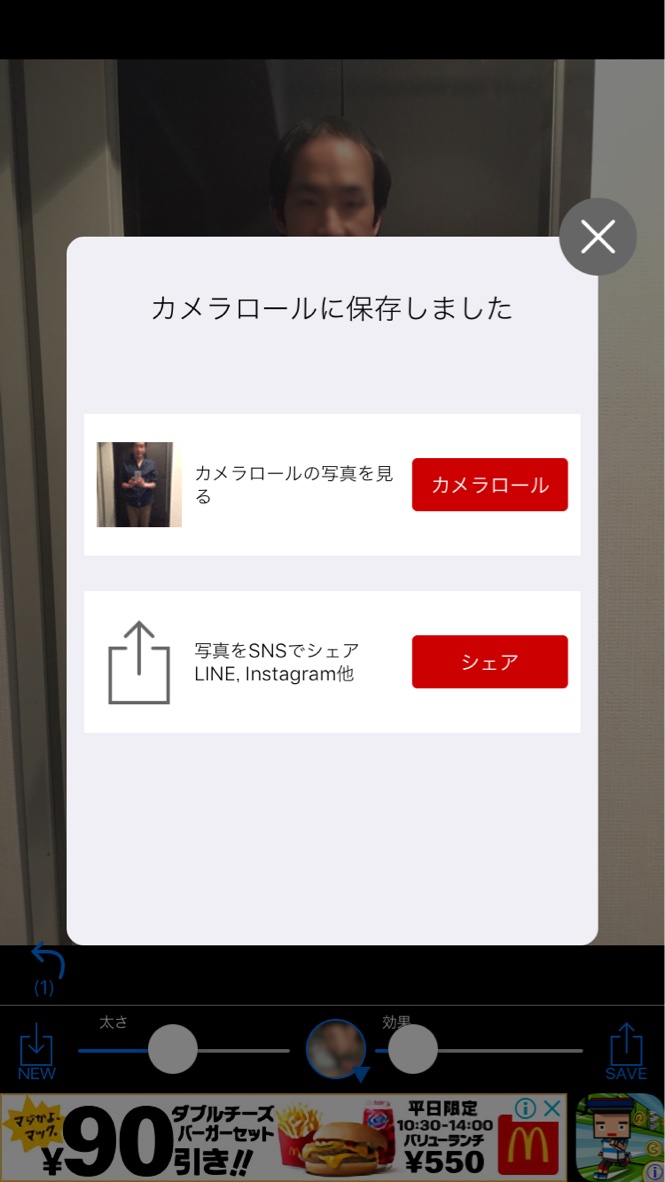バーの横の丸い写真をタッチするとモザイクなども選択できる。 - カメラロールに保存される。