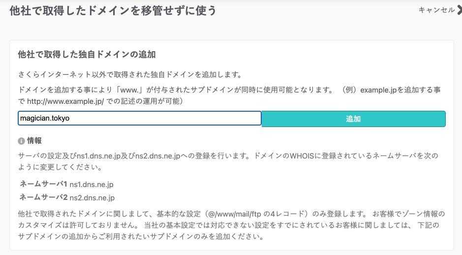 さくらでドメインで「新規の追加で他社で取得したドメインを移管せずに使う」で追加。