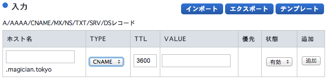 「入力」の「TYPE」を「CNAME」にして「ホスト名」に「magician.tokyo」、「VALUE」に「ghs.google.com」と入力し「追加」ボタンをクリック。