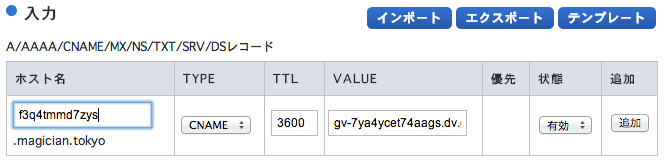 「入力」の「TYPE」を「CNAME」にして「ホスト名」に「f3q4tmmd7zys」(各自違う)、「VALUE」に「gv-7ya4ycet74aags.dv.googlehosted.com」(各自違う)と入力し「追加」ボタンをクリック。