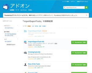 右上の三本線からアドオンを選択して「ImportExportTools NG」を検索。Thunderbirdへ追加をクリックする。