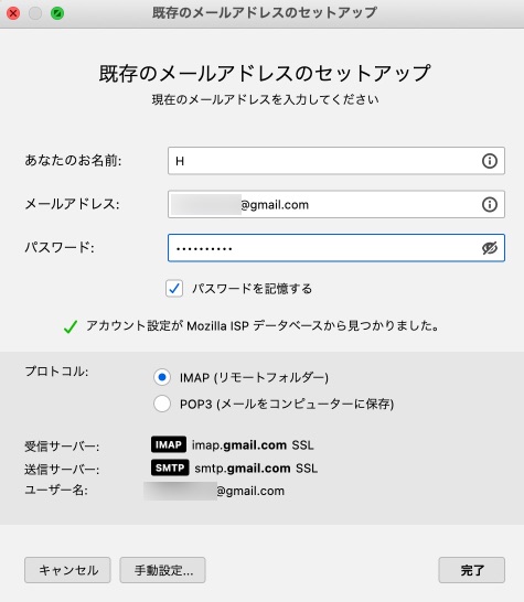 .mboxをインストールするGmailアカウントをThunderbirdに追加する。