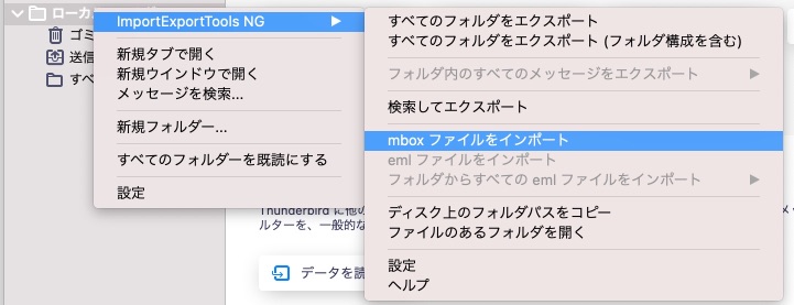 ローカルフォルダーを右クリックしてImportExportTools NG>mboxファ入りをインポートをクリックする。